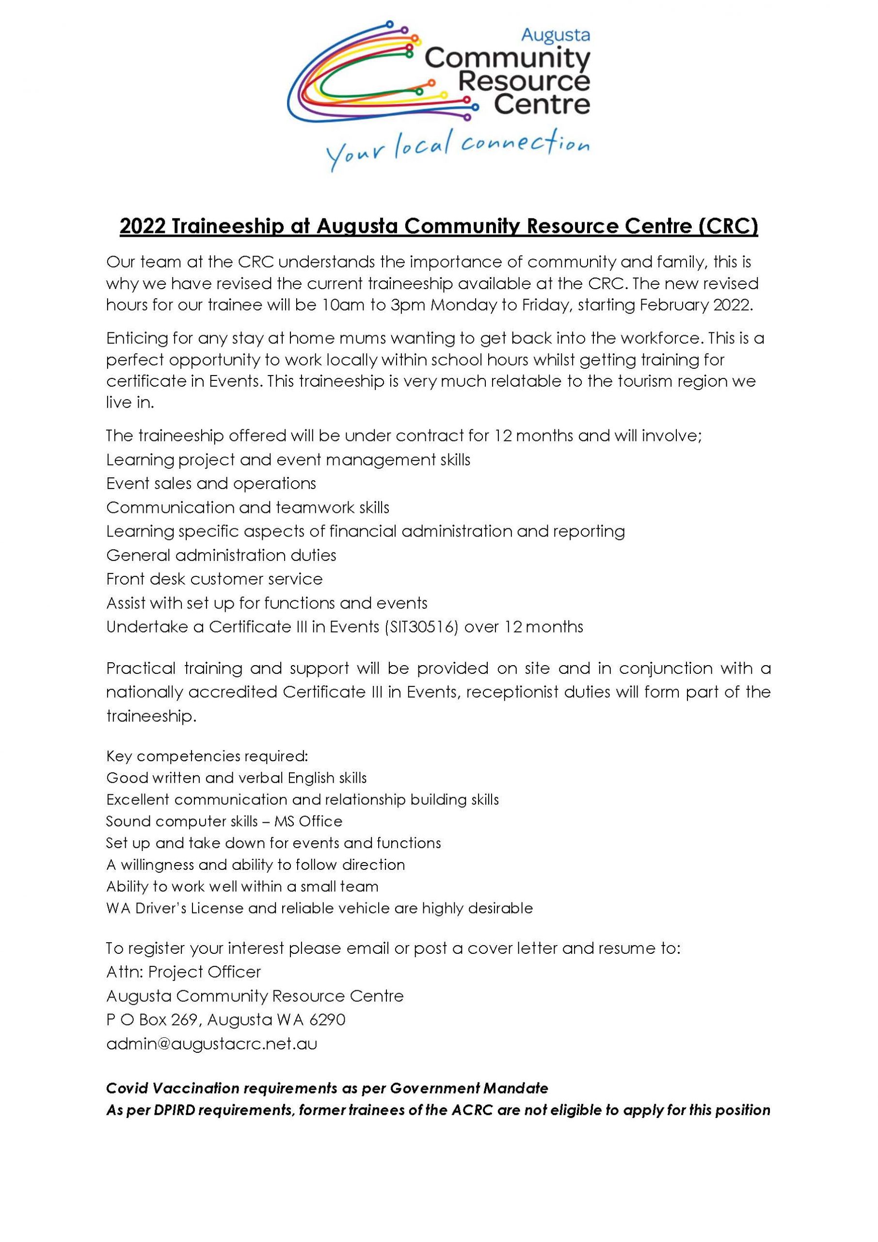 We are on the lookout for a Trainee at Augusta CRC for 2022. Job description includes receptionist duties, working within school hours 10am to 3pm Monday to Friday, get on the job training and a qualification certificate in Events. Email admin@augustcrc.net.au for more details.